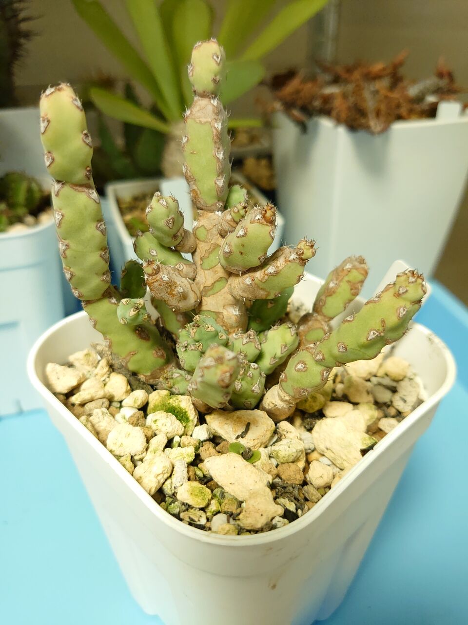 実はタコものは苦手です。E. flanaganiiは丈夫なのでまだしも、他のタコものユーフォルビアは枝が少なめになりがちです。もっと遮光した方が良いのかもしれません。