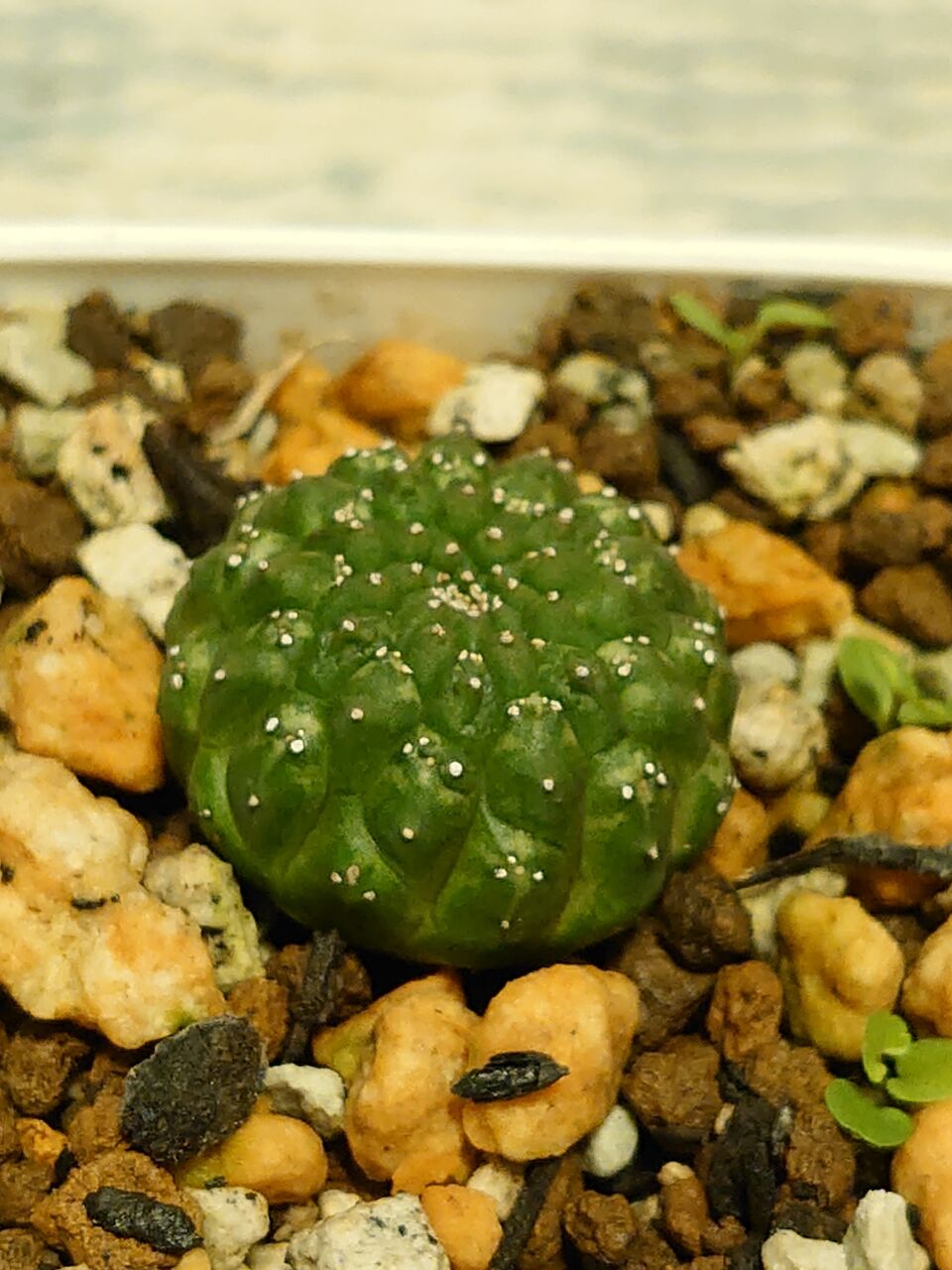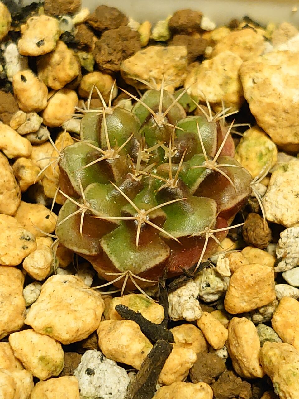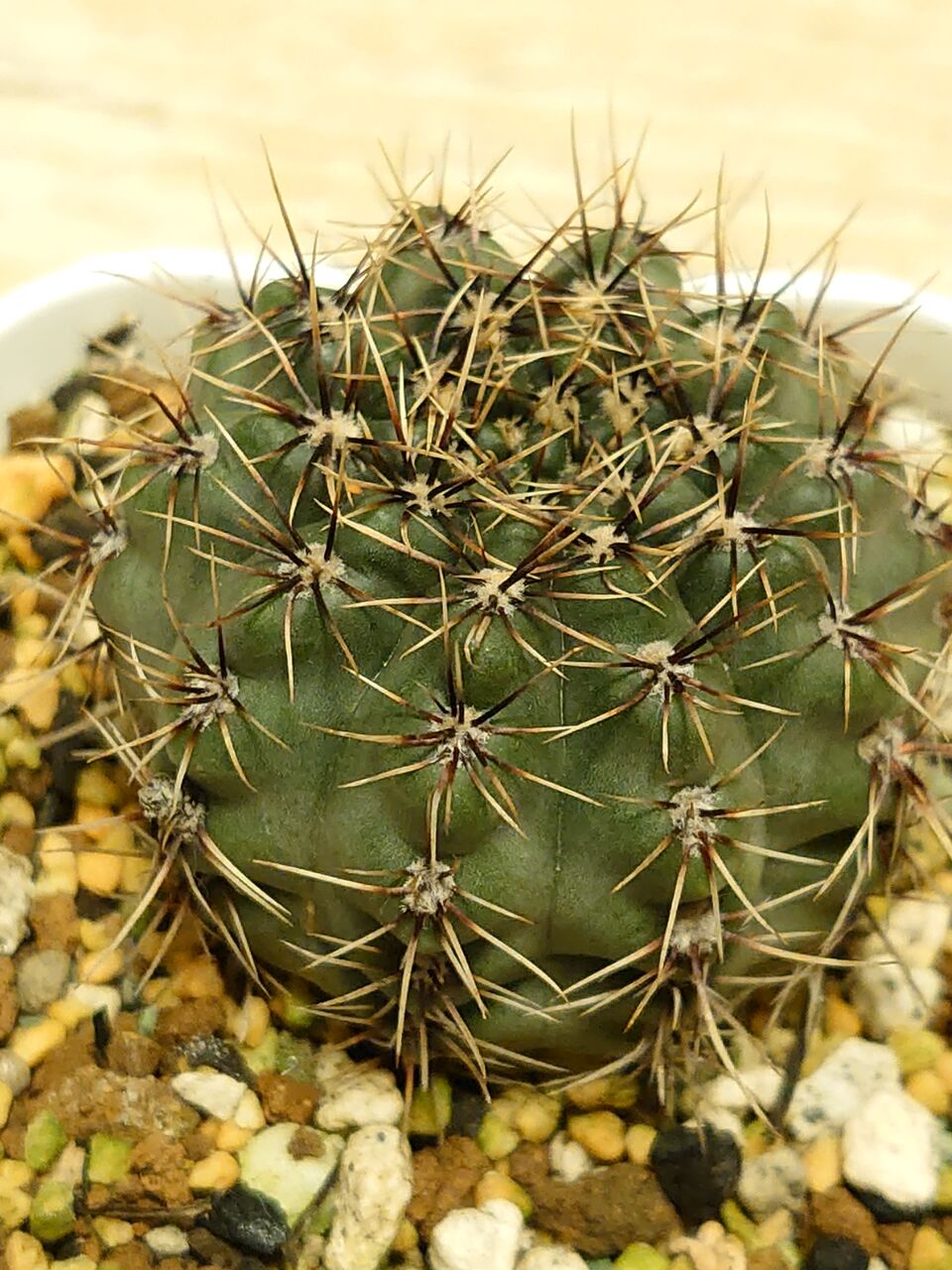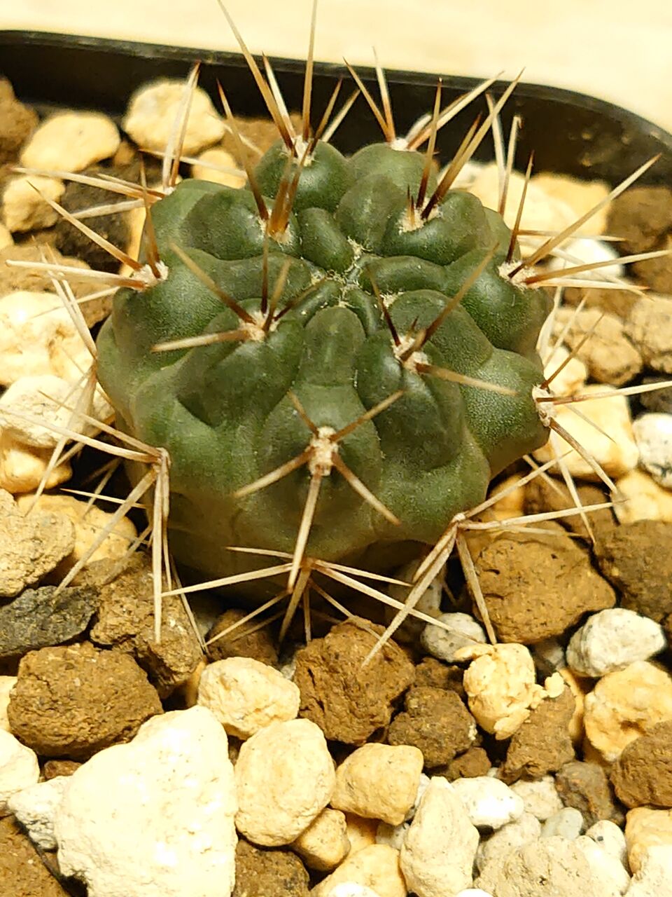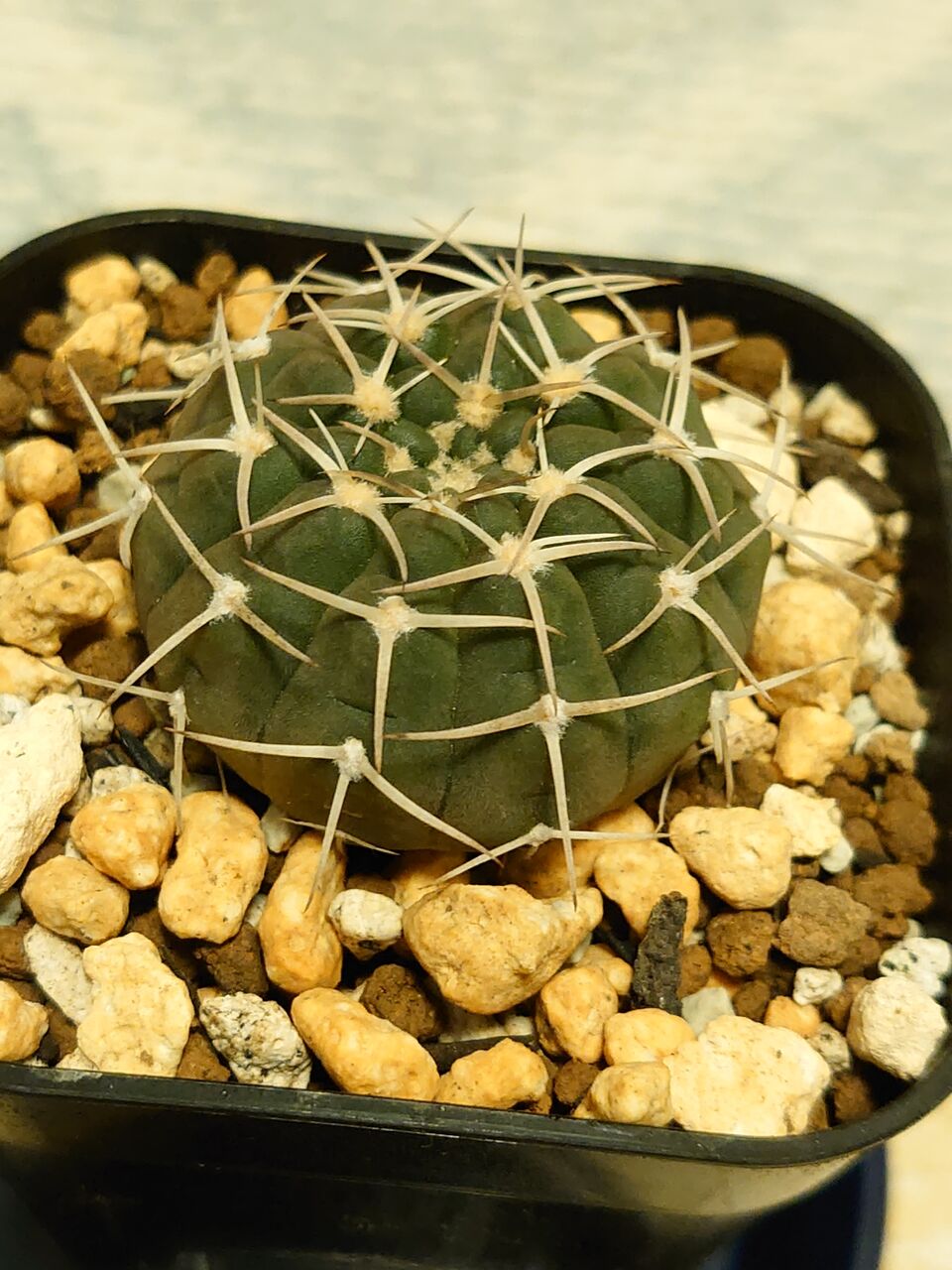 var. cinereumは黒っぽい肌と根元が黒いトゲが特徴と言われています。でも何故か私のvar. cinereumはトゲが白いんですよね。どちらかと言えば守殿玉G. bodenbenderianumに似ています。そもそも、現在はG. ochoterenaeに亜種・変種は認められておりません。本当にギムノカリキウムは泥沼の世界ですね。