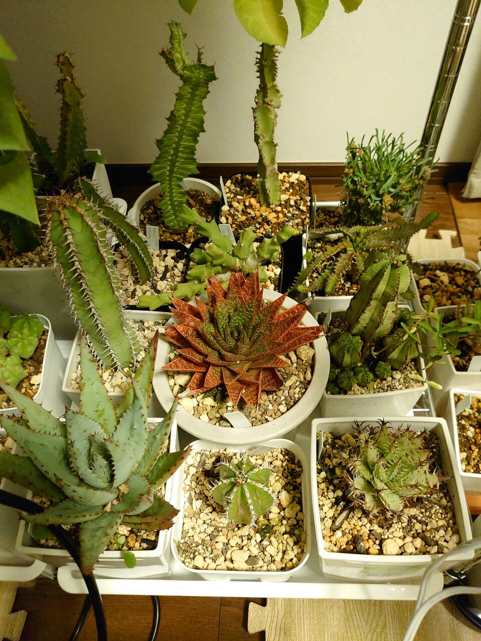 昨日に引き続き、多肉植物の室内への移動というか、避難をしています。サボテンはそれほどありませんが、ギムノカリキウムは平たい小型種を少し集めています。大型のサボテンは冬でも戸外で、簡単な霜除け位で冬越ししています。おそらくは平気だとは思うのですが、最近集めた小型のサボテンは冬に耐えられない気がしますから、念のため室内に取り込みました。