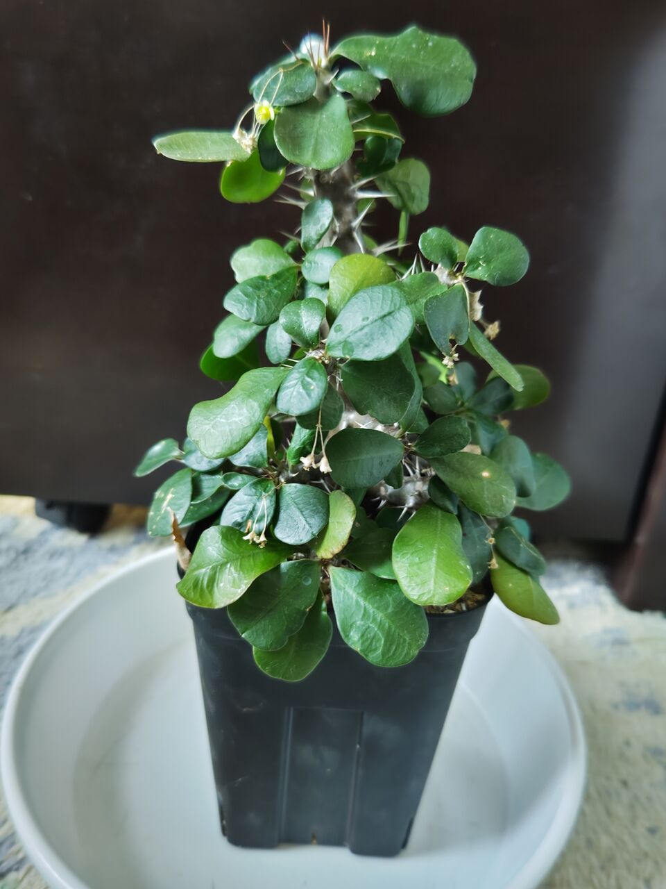 デルフィネンシスは冬の間も目立たない小さな花をよく咲かせていました。しかし、Euphorbia delphinensisで検索すると、普通の赤い花キリンっぽい花が出てきます。我が家のデルフィネンシスの花はなんか違うんですよね。冬の間は日当たりは悪かったのですが、花色ならともかく花の形は変わらんだろうと思案中です。