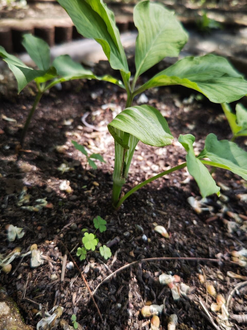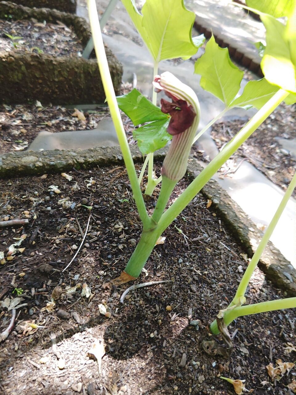 割りとポピュラーな天南星です。天南星は有毒植物とされますが、有毒成分はただのシュウ酸カルシウムです。サトイモ科ですから地下には芋が出来ますが、砕いて水に晒せばデンプンを回収出来ます。これはドングリのアク抜きと同じ手法ですから、縄文人も天南星を食べていたかも知れません。