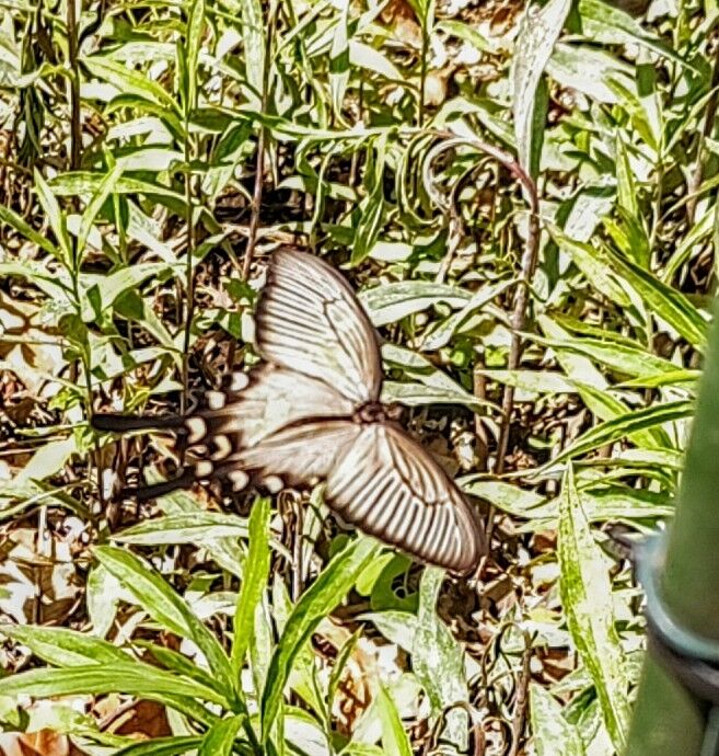 拡大すると何とか確認出来ます。ジャコウアゲハです。日照が強すぎて色が飛んでいますが、大型で美しい蝶です。ウマノスズクサが生える草地が開発などにより減少し、ジャコウアゲハも珍しい蝶となってしまいました。